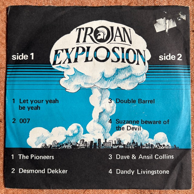 ▼商品概要 アーティスト:V.A. 商品名:Trojan Explosion ▼商品説明 UKレゲエ総本山レーベル、Trojan Records関連音源をまとめたV.A.盤! 「Trojan Explosion」は1969年リリースの企画シングル。トロージャン勢によるロックステディ〜初期レゲエのヒット曲を収録し、英国でクラブヒットシリーズの一枚! 収録曲はスキンヘッドレゲエ中心でハズレなし! ジャマイカ音楽をポップ市場へ広げた時代の象徴的タイトル! スキンヘッドレゲエやロックステディ、Desmond Dekker周辺が好きならマスト! ▼状態 盤:EX ジャケット:VG+ ※若干のチリプリ音は確認できるが、コンディション抜群の良品! ※ジャケットにシール跡 ※照明の影響により白トビ、シャドーが発生している場合がございます