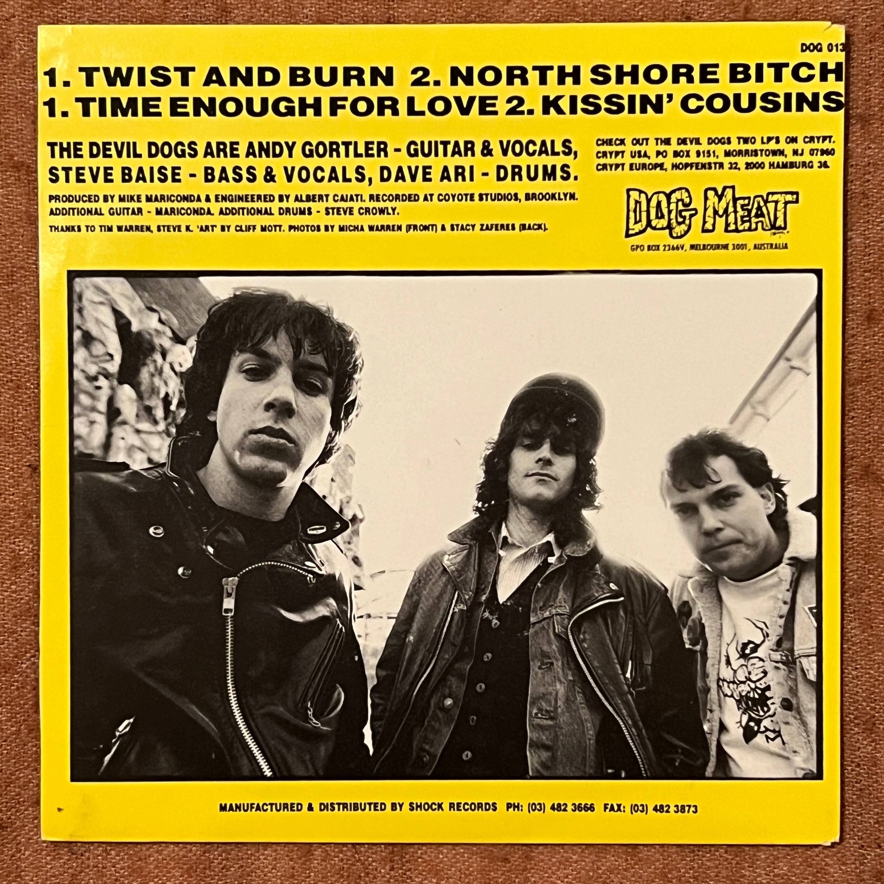 DEVIL DOGSは1989年にAndy Gを中心にニューヨークで結成されたガレージパンクバンド。Ramonesの影響を受けつつ、荒削りなロックンロールを加速させたサウンドでシーンに存在感を示した。7インチ「Twist And Burn」は初期の代表的作品で、タイトル曲は切れ味鋭いギターと疾走するビートが絡み合う痛快なガレージパンクナンバー! どの曲もシンプルで勢いのあるロックンロールを展開し、スタジオ録音ながらライブ感を色濃く感じさせ、バンドの衝動をそのまま刻み込んだ一枚。ガレージパンクの楽しさとエネルギーを凝縮した7インチ!