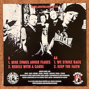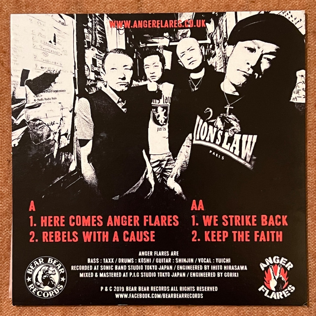 ANGER FLARESは1999年に神戸で結成された、英国Oi!サウンドを土台にしながらシンガロング必至のOi!/ストリートパンクバンド。7インチ『HERE COMES ANGER FLARES』は、バンド名を冠したタイトル通り、彼らの登場を高らかに告げる象徴的なEP! 冒頭から荒々しいギターリフと突進するビートが炸裂し、ストリートのざらついたリアリティとキャッチーなメロディが自然に交差。シンプルながら力強いコーラスは拳を掲げたくなるような衝動を呼び起こす。録音にはライブ感が漲り、観客の熱狂を目前に感じるような臨場感を宿している点も大きな魅力! 全編を通して無骨さと勢いに溢れながらも、どこか親しみやすいメロディが漂い、Oi!パンクの醍醐味である“団結と怒り”を体現。ストリートパンクの王道を貫きつつ、次世代へと続くパワーを見せつけた一枚!