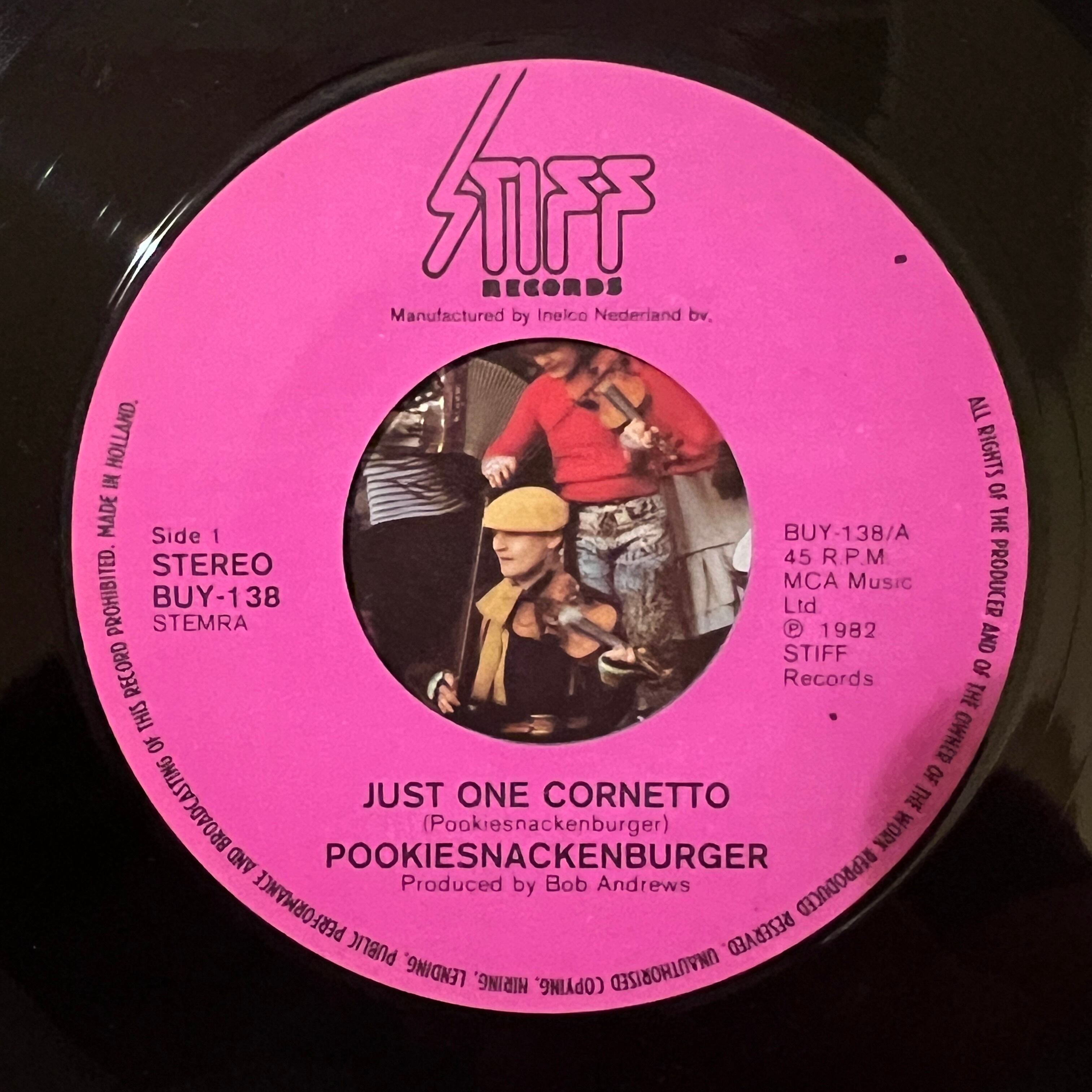 POOKIESNACKENBURGERは1982年に登場したロンドン発のパフォーマンス集団で、ストリート演劇や即興を取り込みながら音楽を展開した異色の存在。後にBeats Internationalやパーカッション・ショウ「STOMP!」を立ち上げるLuke CresswellやSteve McNicholasも在籍し、そのユーモアと実験精神は後の活動にもつながっている。7インチ『Just One Cornetto』は、彼らの代表的なシングルで、アイスクリームのコルネットを題材にしたクラブヒットナンバー! 軽快なリズムとコミカルな歌詞、耳に残るメロディが融合し、聴くだけで思わず笑みがこぼれるようなユーモラスな仕上がりとなっている。B面「Turkish Bath」もその遊び心を引き継ぎ、風刺と茶目っ気を交えたスタイルで一筋縄ではいかないバンドの本領を発揮。演奏技術を誇示するよりも、即興性やパフォーマンス性を前面に押し出し、聴き手を巻き込む楽しさを追求した一枚だ。スカやパンクのエネルギーを基盤に、ポップで親しみやすいフレーズを組み合わせたこの作品は、バンドの個性をそのまま刻み込んだユニークなシングル!