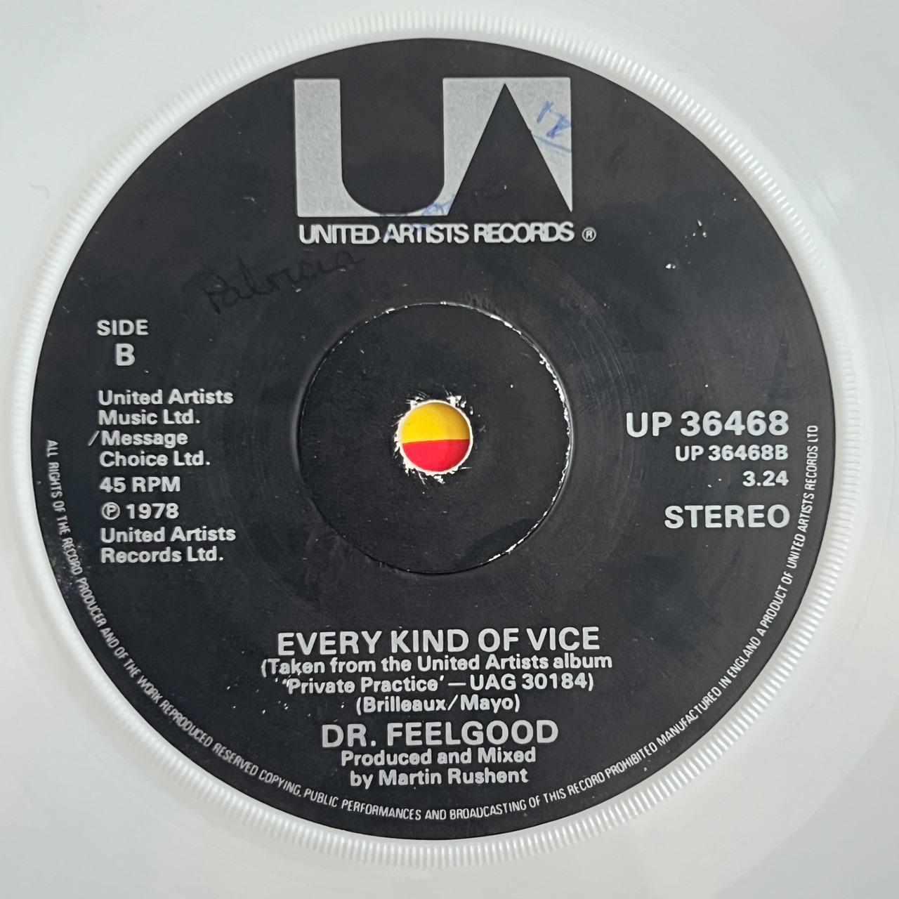 Dr. Feelgoodは70年代イギリスのパブロック・シーンを牽引したバンドで、荒々しくもシンプルなロックンロールで支持を集めたバンド。ウィルコ・ジョンソン脱退後に1979年リリースされた「Milk And Alcohol」7インチ盤! UKチャート9位を記録した彼ら最大のヒットシングル! 曲はNick LoweとギタリストGypie Mayoの共作でリキュール入りのミルクと夜遊びを題材にしている。 B面は「Every Kind of Vice」を収録。