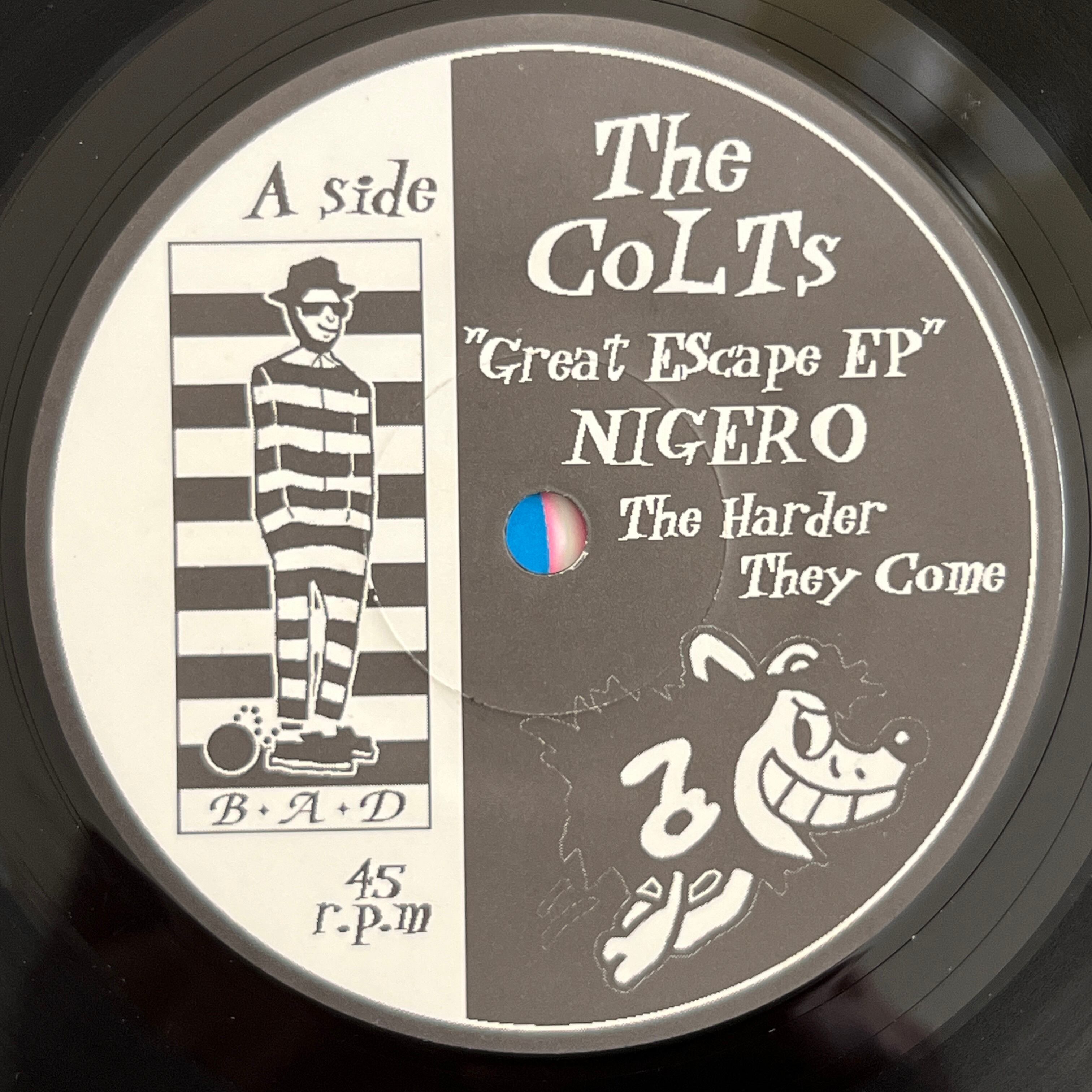 THE COLTS は日本を代表する50s〜60sのR&R/スカ/パンクの要素を飲み込んだ“ジャンル横断ロックンロール”バンド。The Great Escape EP は初期代表曲の「Nigero」「The Harder They Come」「Easy Come & Eazy Go」「Ai Ai The Monkey」を収録した、今や激レア7インチ! 50s〜60s ロックンロール、ロカビリー、スカ/ラスティック好きなら、マストバイ! The Clash7インチをパロったジャケもサイコー!