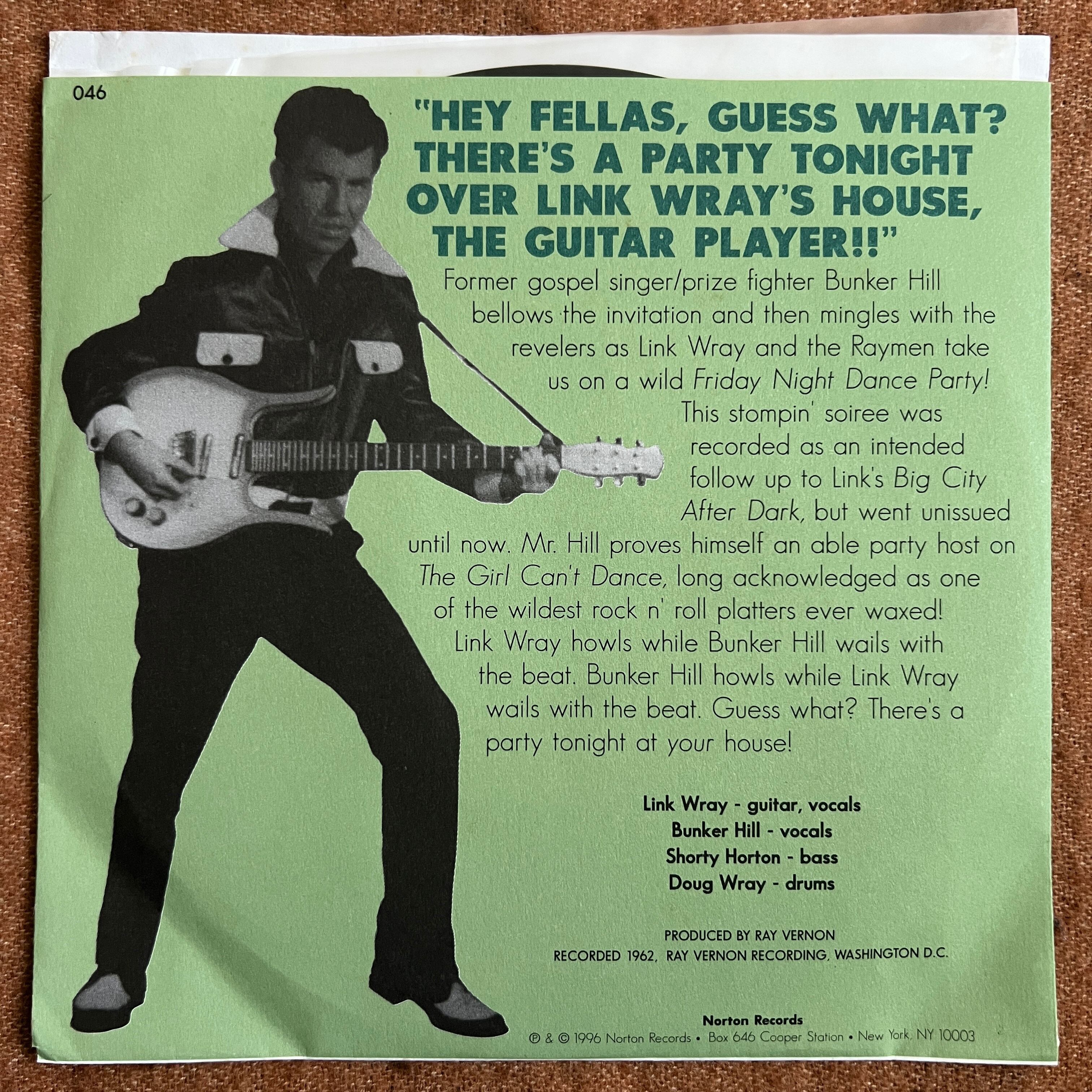 Link Wrayは歪んだギターサウンドで後のR&Rやパンクに大きな影響を与えた重要人物。『Friday Night Dance Party』は1963年のダンスナンバーで数少ないヴォーカル収録曲! B面はBunker Hillの荒々しいヴォーカル「The Girl Can't Dance」で、これぞワイルドR&R! どちらもクラブヒッツのダブルサイダー!